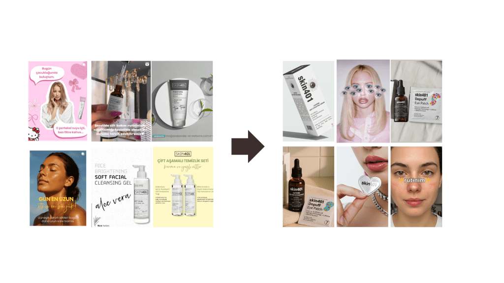 Objective: To restructure Skin401’s existing content strength with a trustworthy visual identity and clear strategic tone. The goal was to merge two key qualities: the feeling of scientific credibility and the “confident simplicity” that resonates with modern young women.