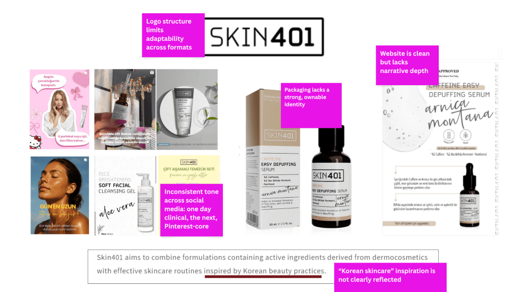 🎯 Goal: To translate Skin401’s existing credibility into a more cohesive, recognizable identity — one that builds emotional connection without losing trust.